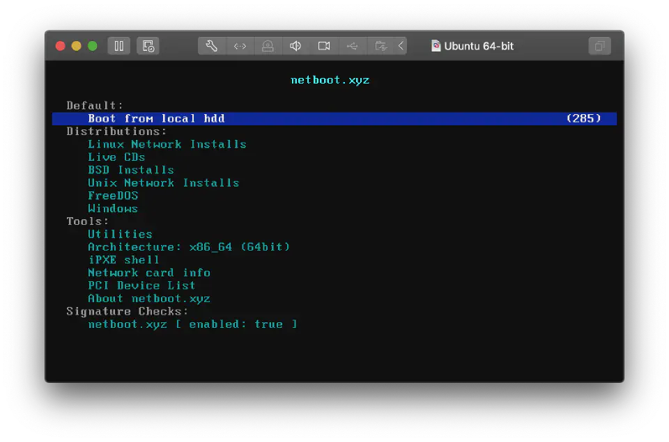 Since really needed to re-install the machine such that I could use it for some heavy Docker builds, I needed to come up with a workaround. This is when I realized that I could in theory install Debian using PXE boot. I was a bit hesitant at first, but then I ran across netboot.xyz. In short netboot.xyz is a boot image that allows you to select among a large number of distributions and tools.